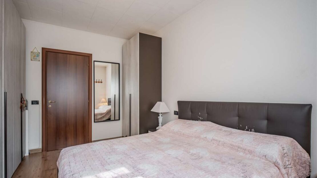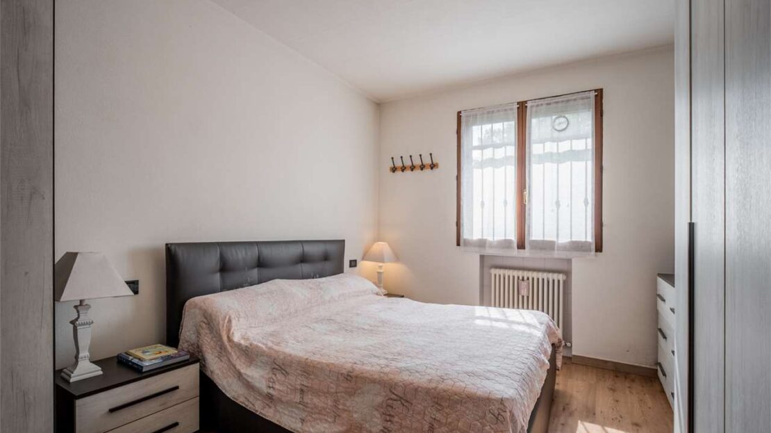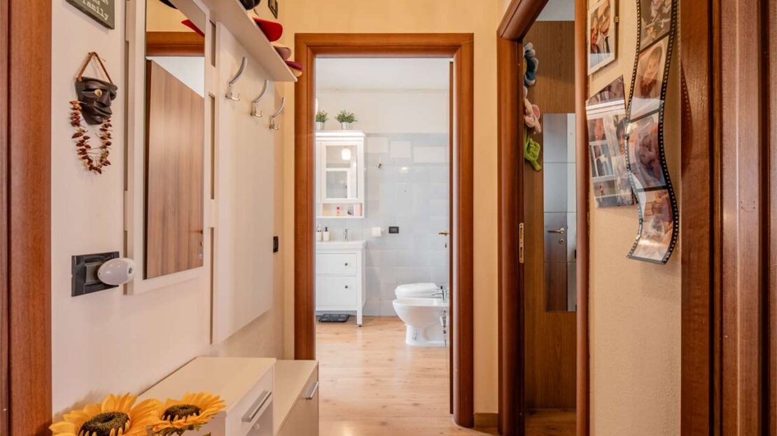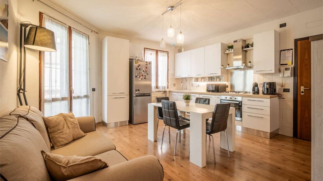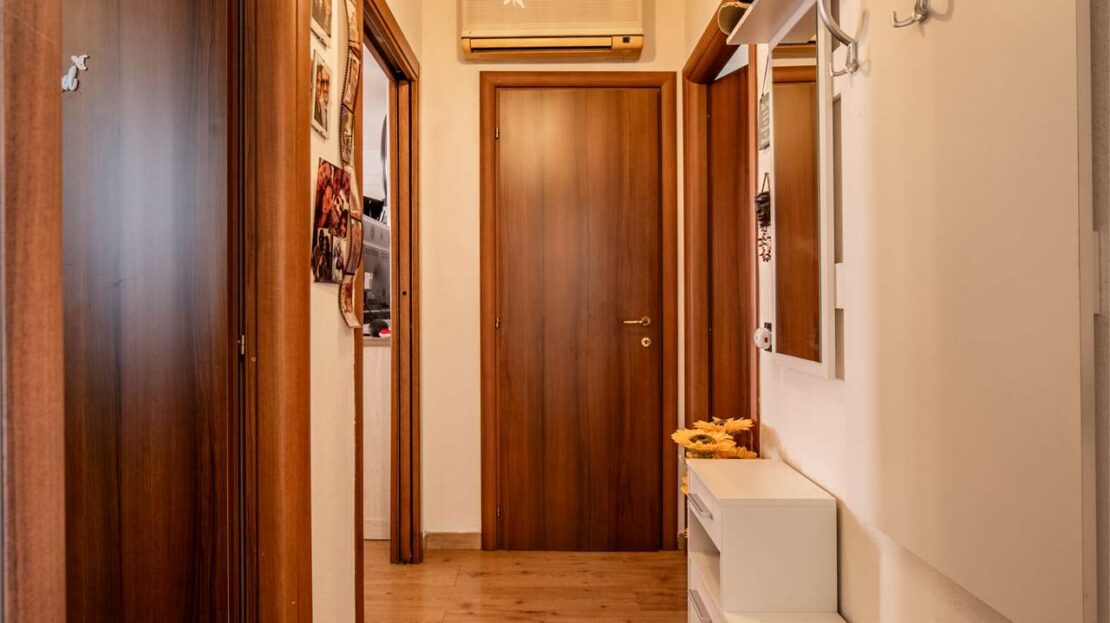 L’ingresso si apre su una zona giorno luminosa con angolo cottura e accesso al primo comodo balcone. La zona notte è composta da due camere matrimoniali e da un bagno con secondo balcone.