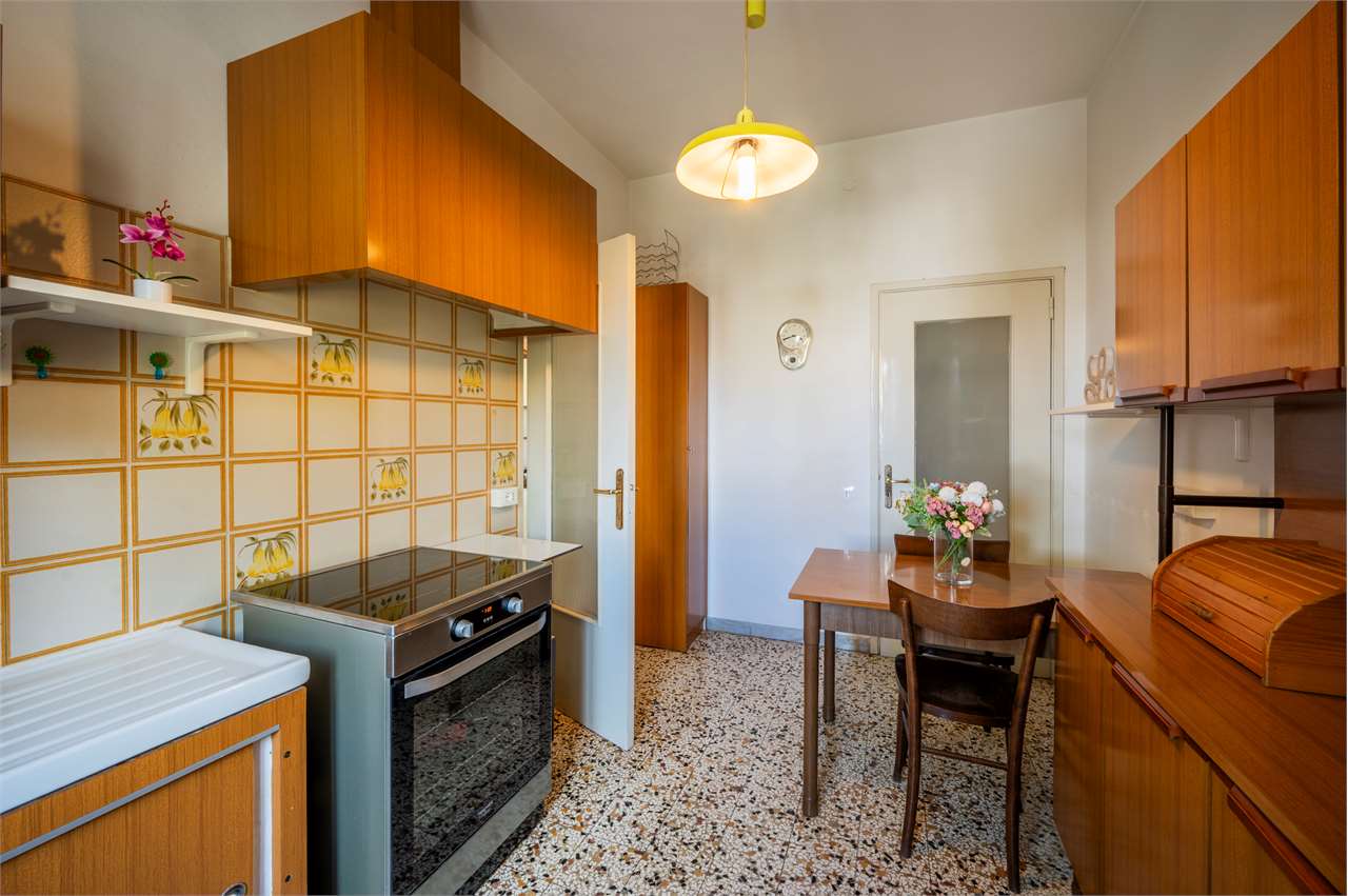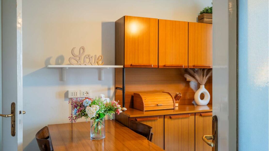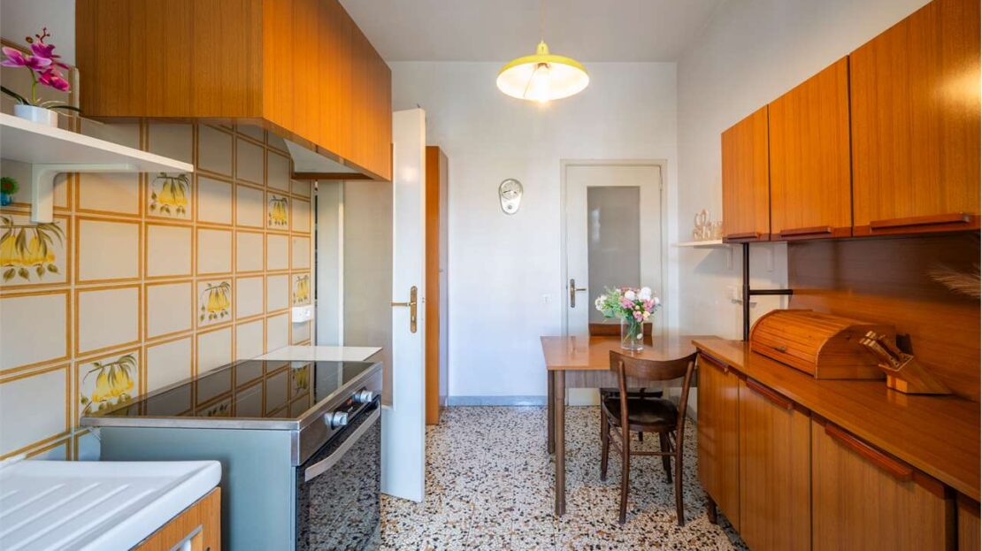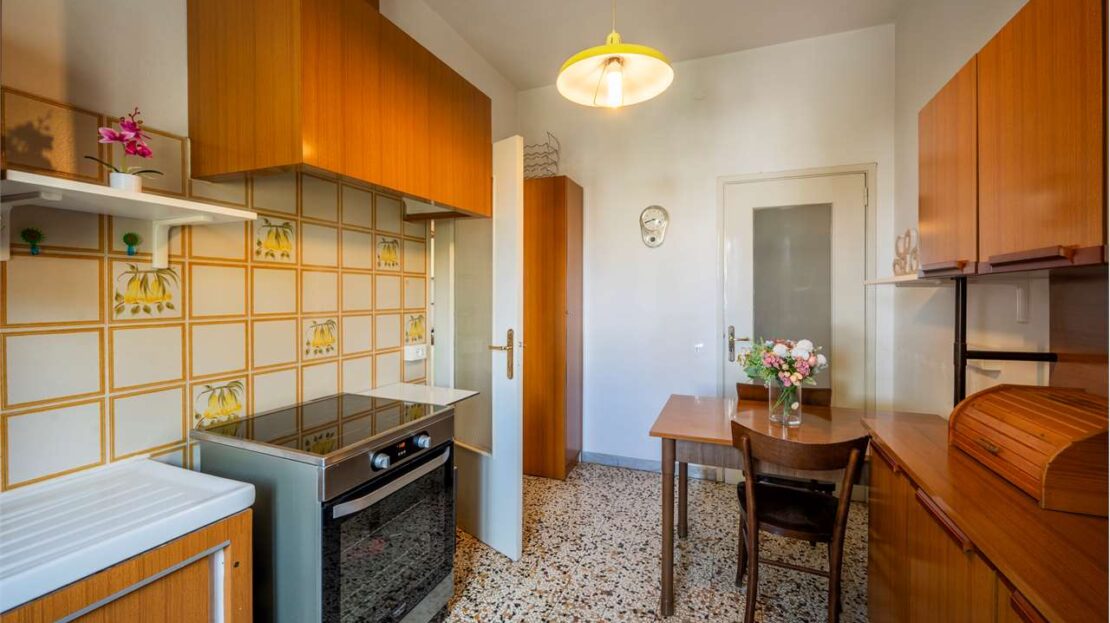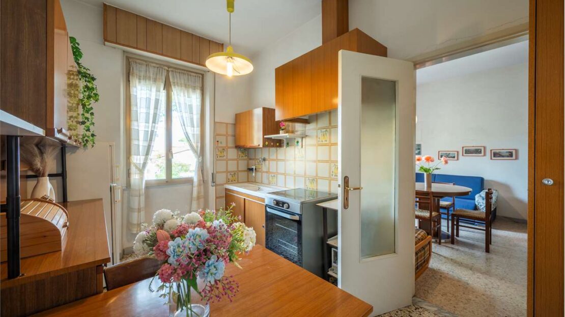 Cucina separata con balcone (che offre la possibilità, in caso di ristrutturazione, di ricavare una cameretta aggiuntiva e un soggiorno-pranzo più contenuto, così da aumentare i posti letto)