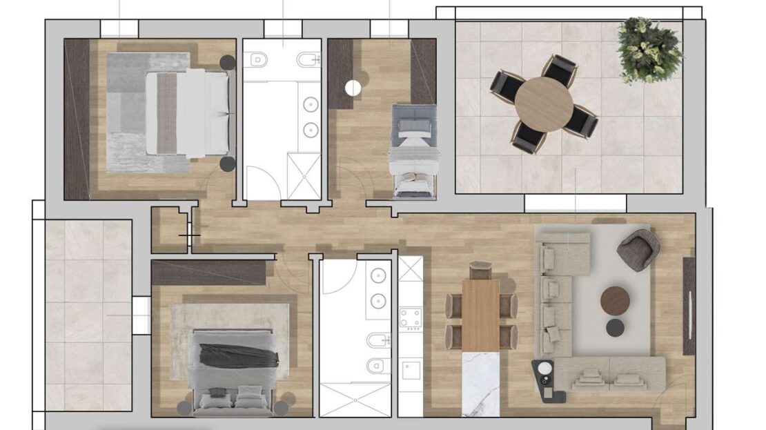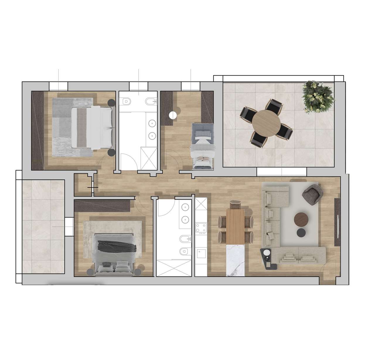 una splendida loggia coperta di 23 m², perfetta per pranzi all’aperto, relax, area living esterna o come prolungamento naturale della zona giorno.