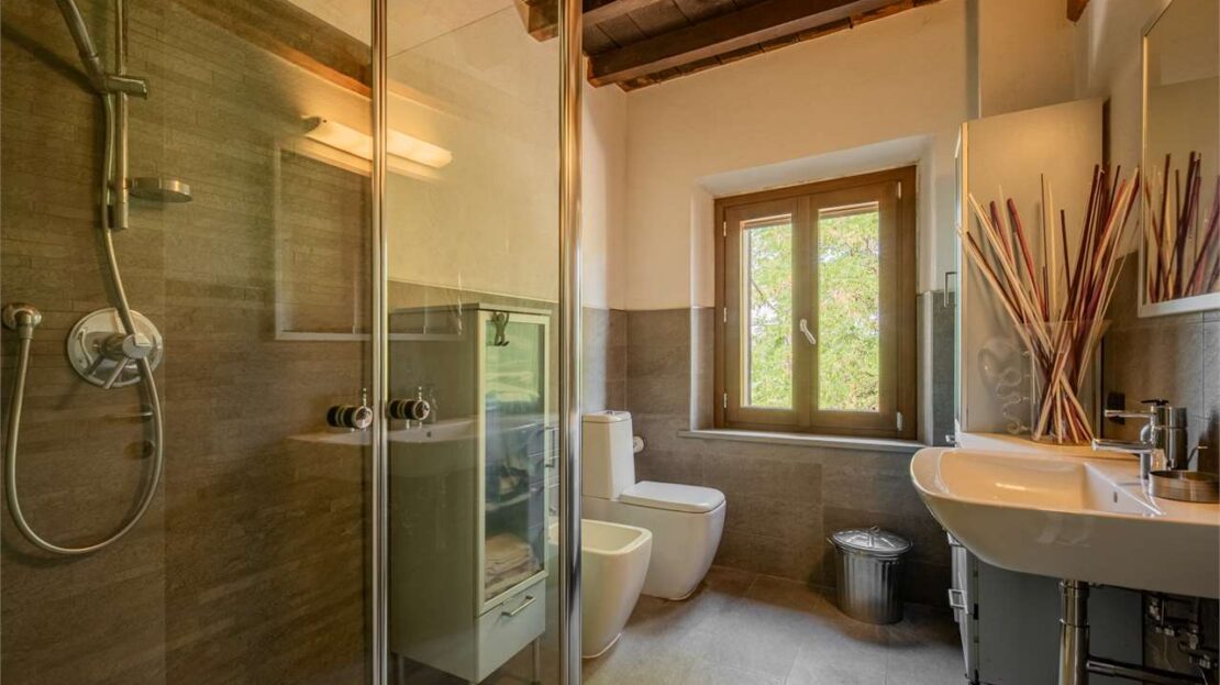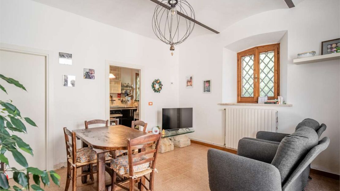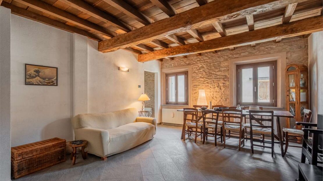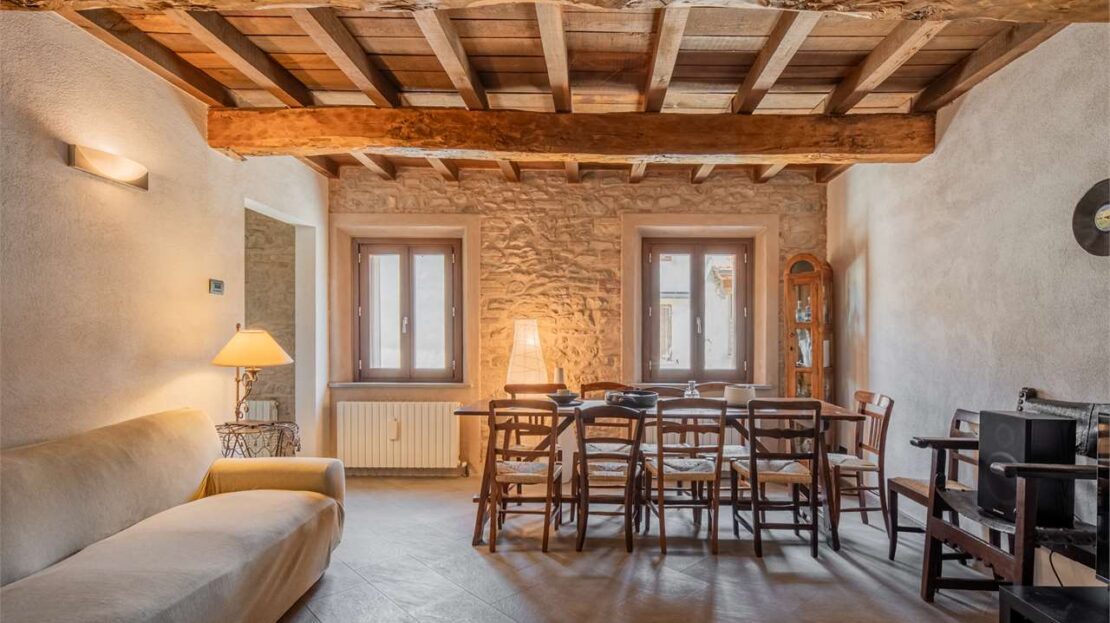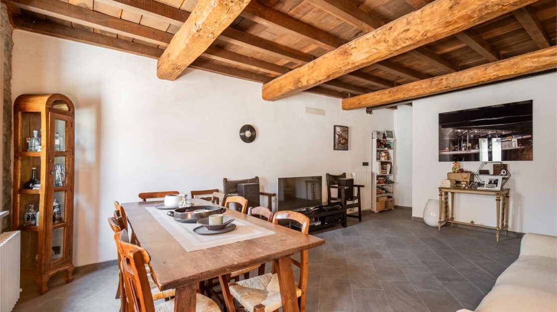 La zona giorno al piano terra conserva finiture degli anni ’80, mentre al primo piano è stata completamente ristrutturata tra il 2008 e il 2010, con pavimenti in ceramica, serramenti in legno con doppio vetro, pareti in sasso a vista e travi in legno che creano un’atmosfera calda ed accogliente.