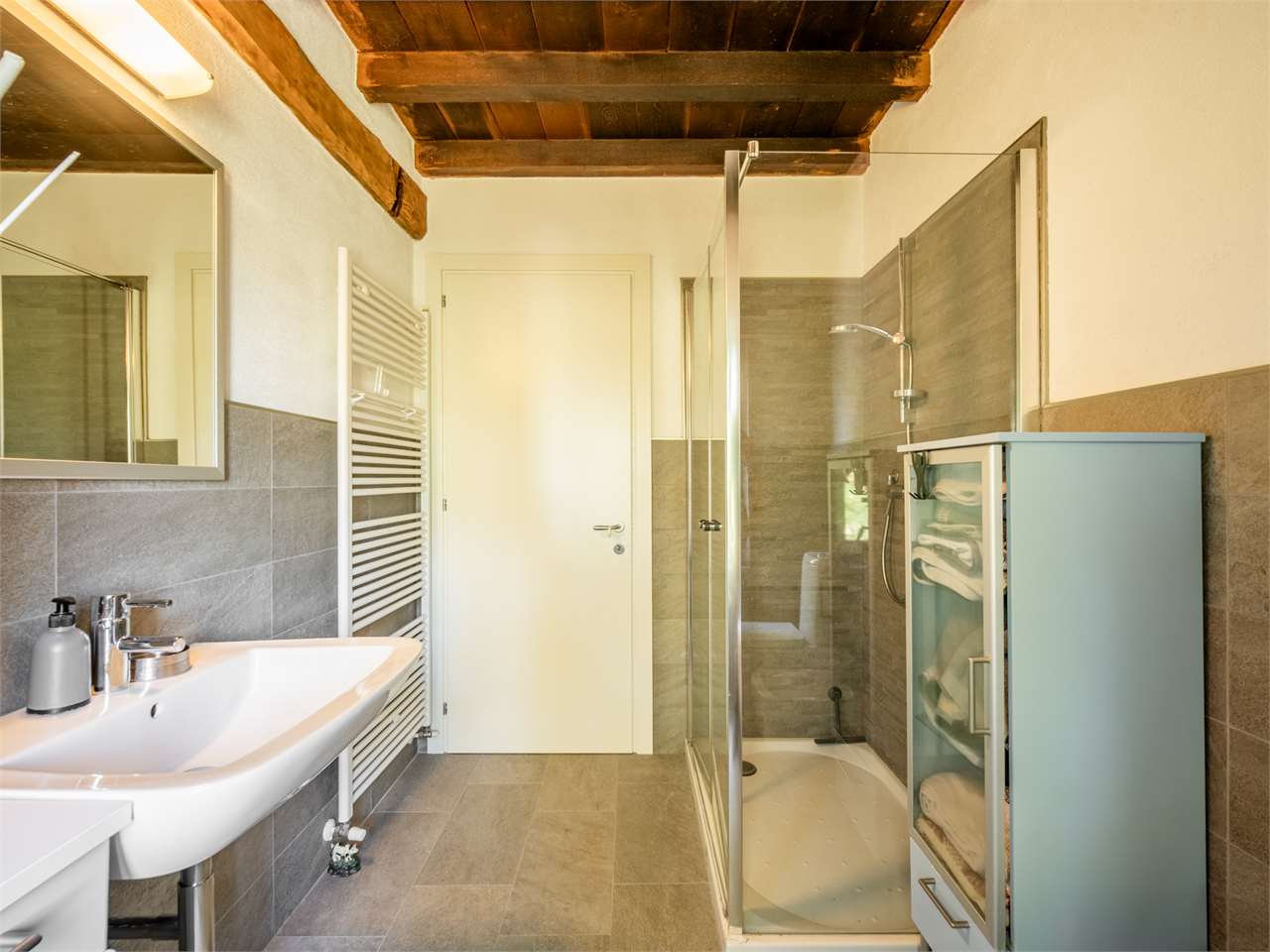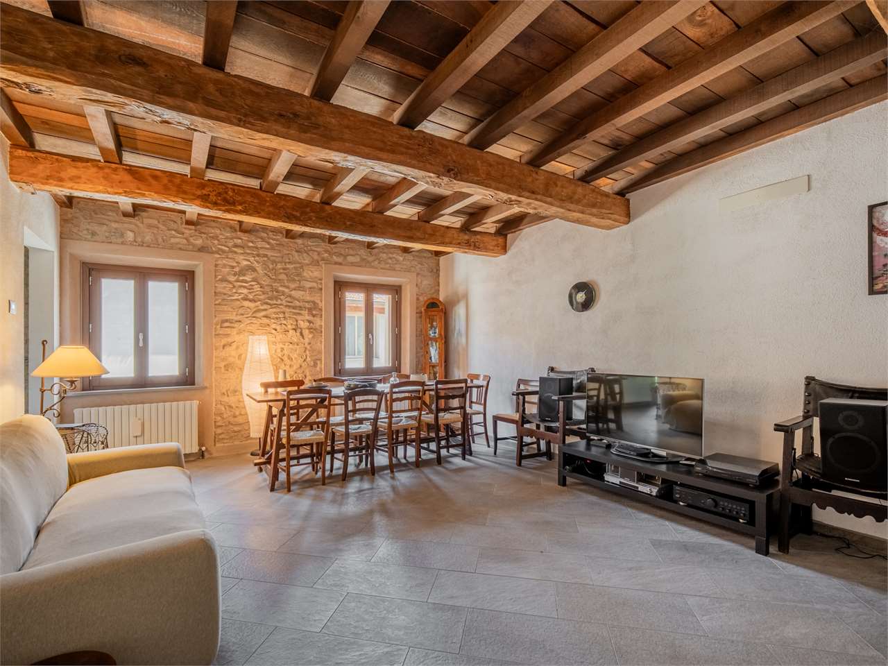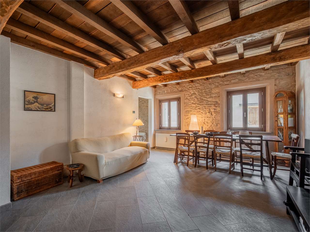 La zona giorno al piano terra conserva finiture degli anni ’80, mentre al primo piano è stata completamente ristrutturata tra il 2008 e il 2010, con pavimenti in ceramica, serramenti in legno con doppio vetro, pareti in sasso a vista e travi in legno che creano un’atmosfera calda ed accogliente.
