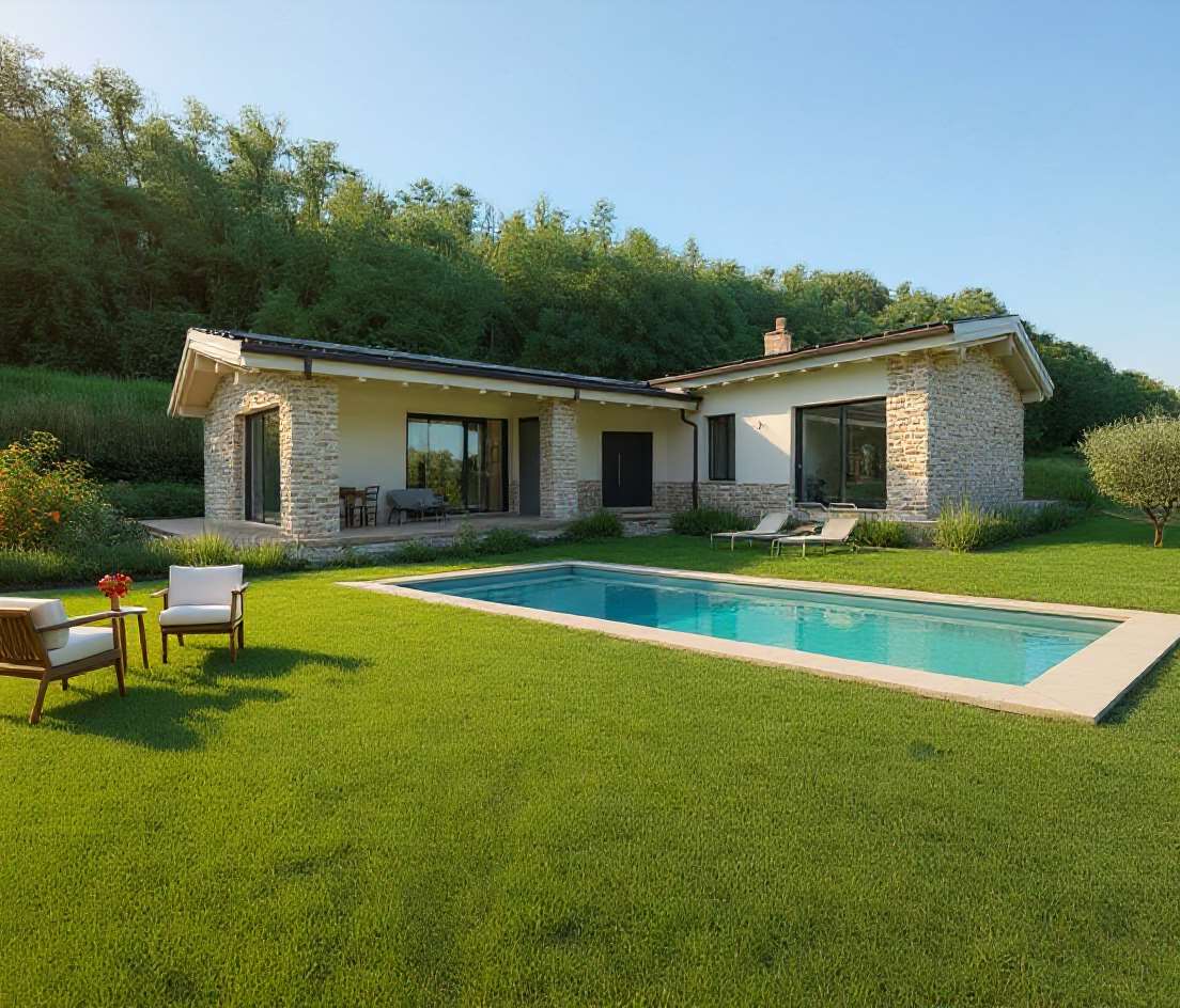 La Villa A, in fase di costruzione, è una villa singola sviluppata interamente su un unico piano, inserita in un lotto di circa 1.000 mq. Grandi vetrate aprono la zona giorno verso il giardino privato, regalando luminosità e continuità tra spazi interni ed esterni.